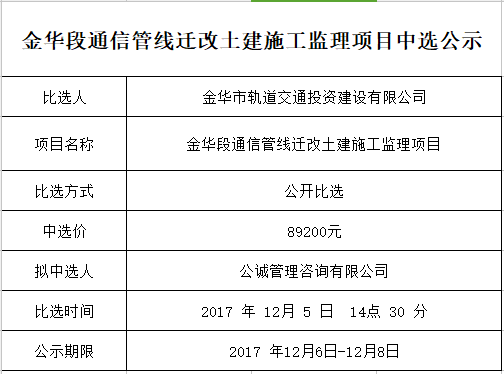 金華段通信管線遷改土建施工監(jiān)理項目中選公示