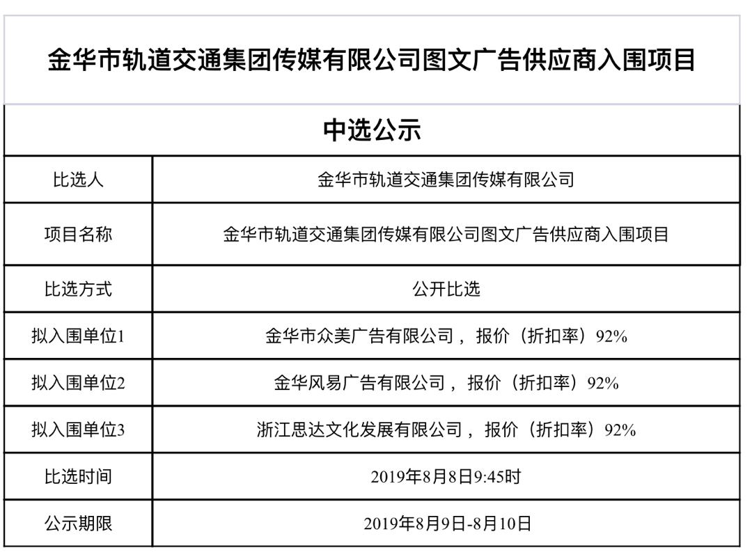 金華市金義東軌道交通有限公司運營2026-2027年度活動實施服務(wù)機構(gòu)框架協(xié)議項目中標候選人公示
