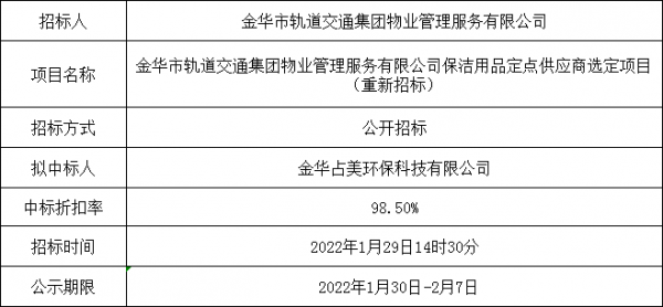 金華市軌道交通集團物業(yè)管理服務(wù)有限公司保潔用品定點供應(yīng)商選定項目的中標(biāo)公示