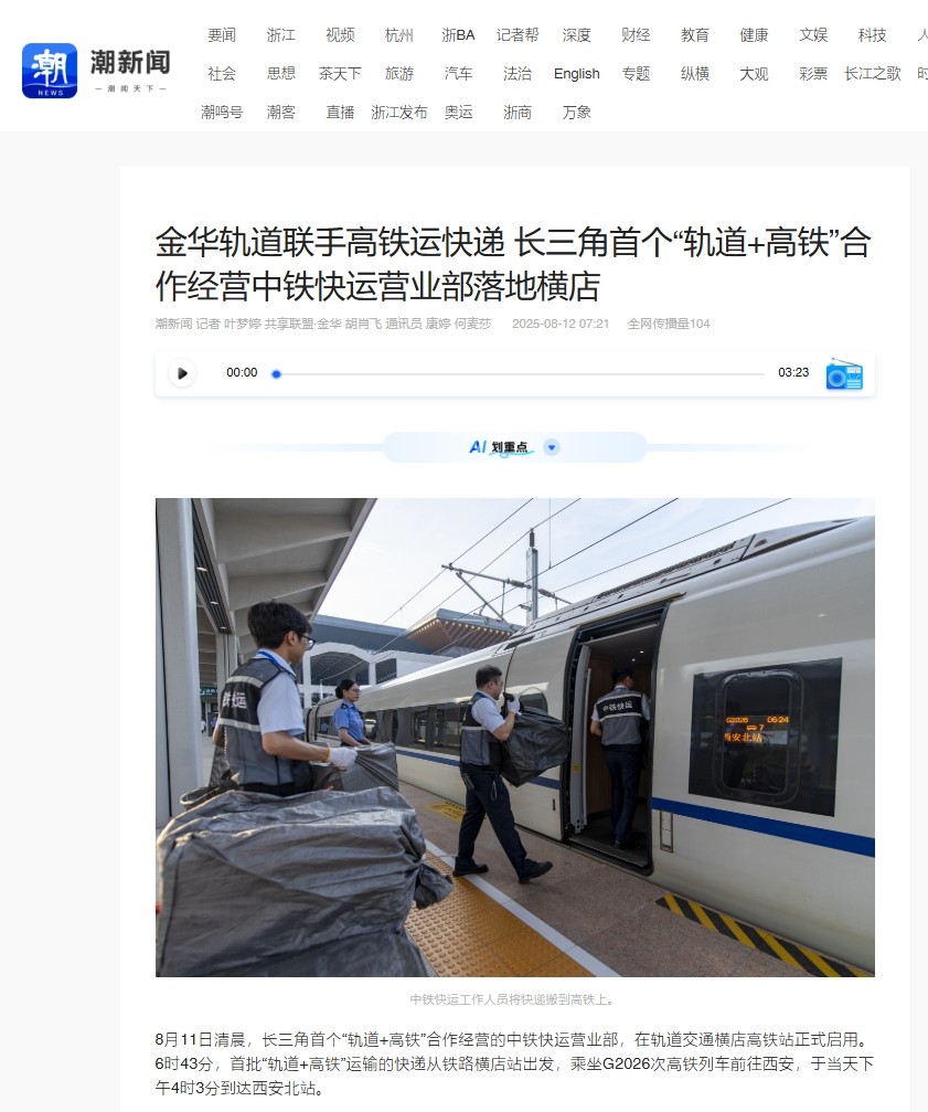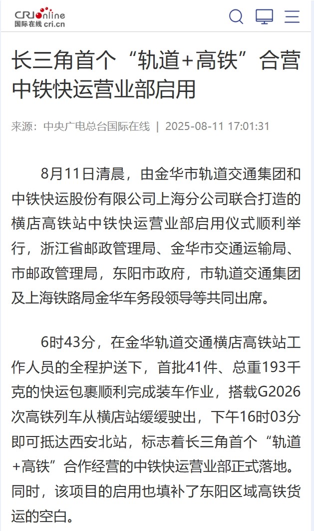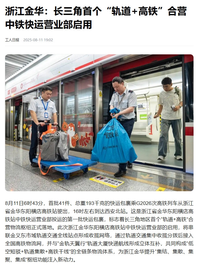 8月11日,長三角首個“軌道+高鐵”合營中鐵快運營業(yè)部啟用。該營業(yè)部將串聯(lián)金義東市域軌道交通全線站點形成收攬網(wǎng)絡(luò),在全線31座車站均可辦理業(yè)務(wù),通過軌道交通集中收攬分撥后接入全國高鐵物流網(wǎng)。